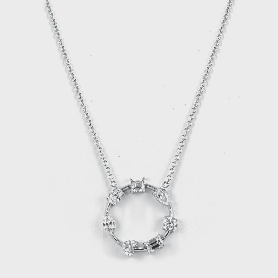 This round pendant necklace features 7 fancy shaped diamonds that weigh a total of 1.17 carats and are beautifully set in 18-karat white gold.