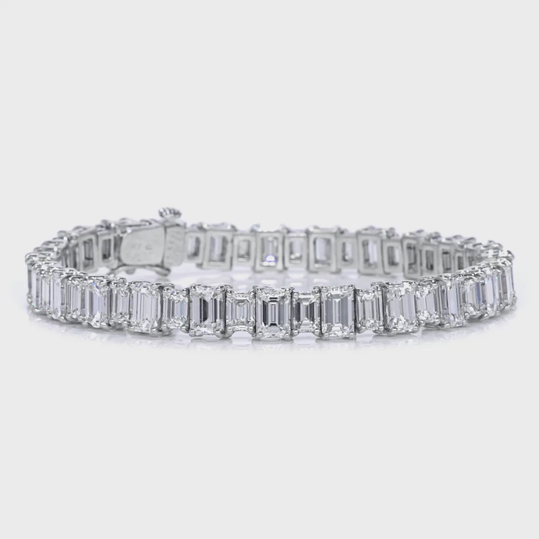 Emerald cut diamond prong straight-line alternating tennis bracelet in platinum. It has a carat total weight of 19.33 and has 48 F color, VS clarity diamonds.