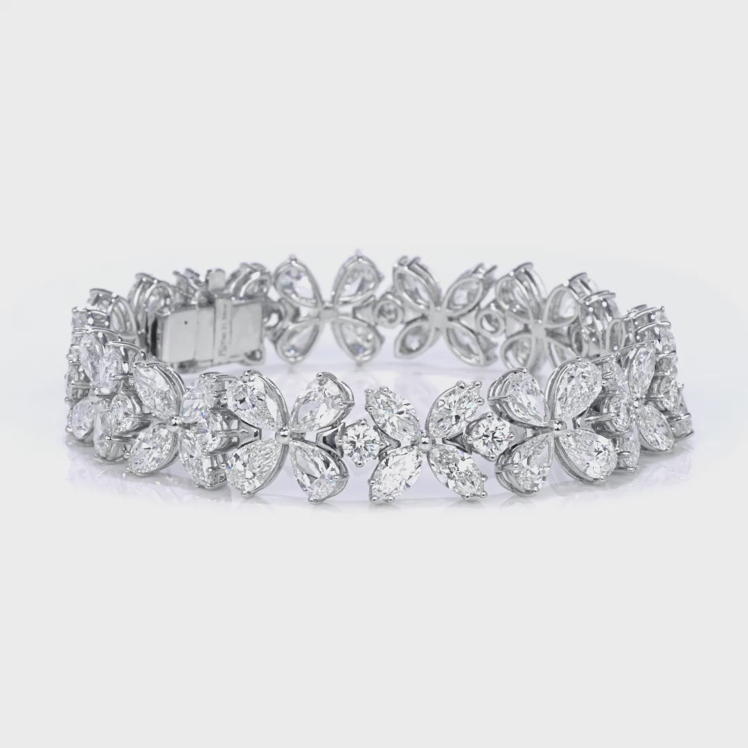 Mixed cut diamond fancy set tennis bracelet in platinum. The diamonds have a total carat weight of 19.56. There are 56 F color, VS clarity diamonds in the bracelet.