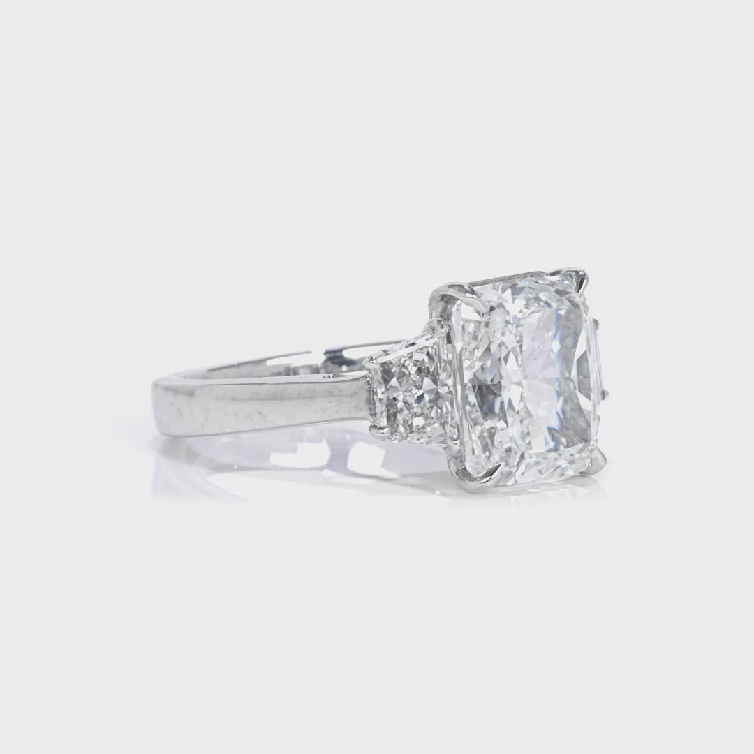 4.05ct Cushion Cut Diamond Three Stone Ring with Trapezoid Side Stones in Platinum Band, GIA Certified