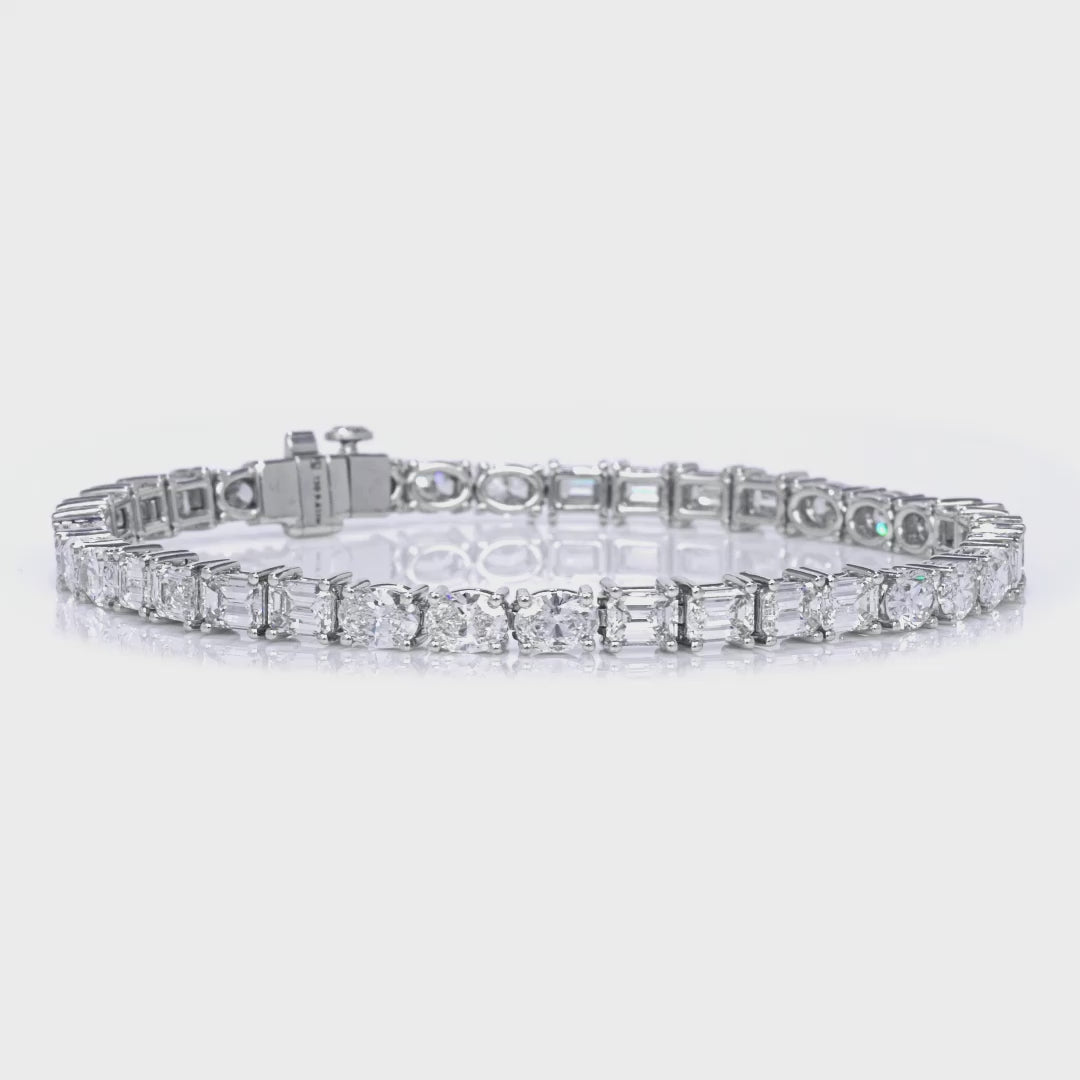 East-west emerald cut and oval cut diamond alternating prong tennis bracelet in 18-karat white gold. The diamonds have a total carat weight of 9.61. There are 37 F color, VS clarity diamonds in the bracelet.