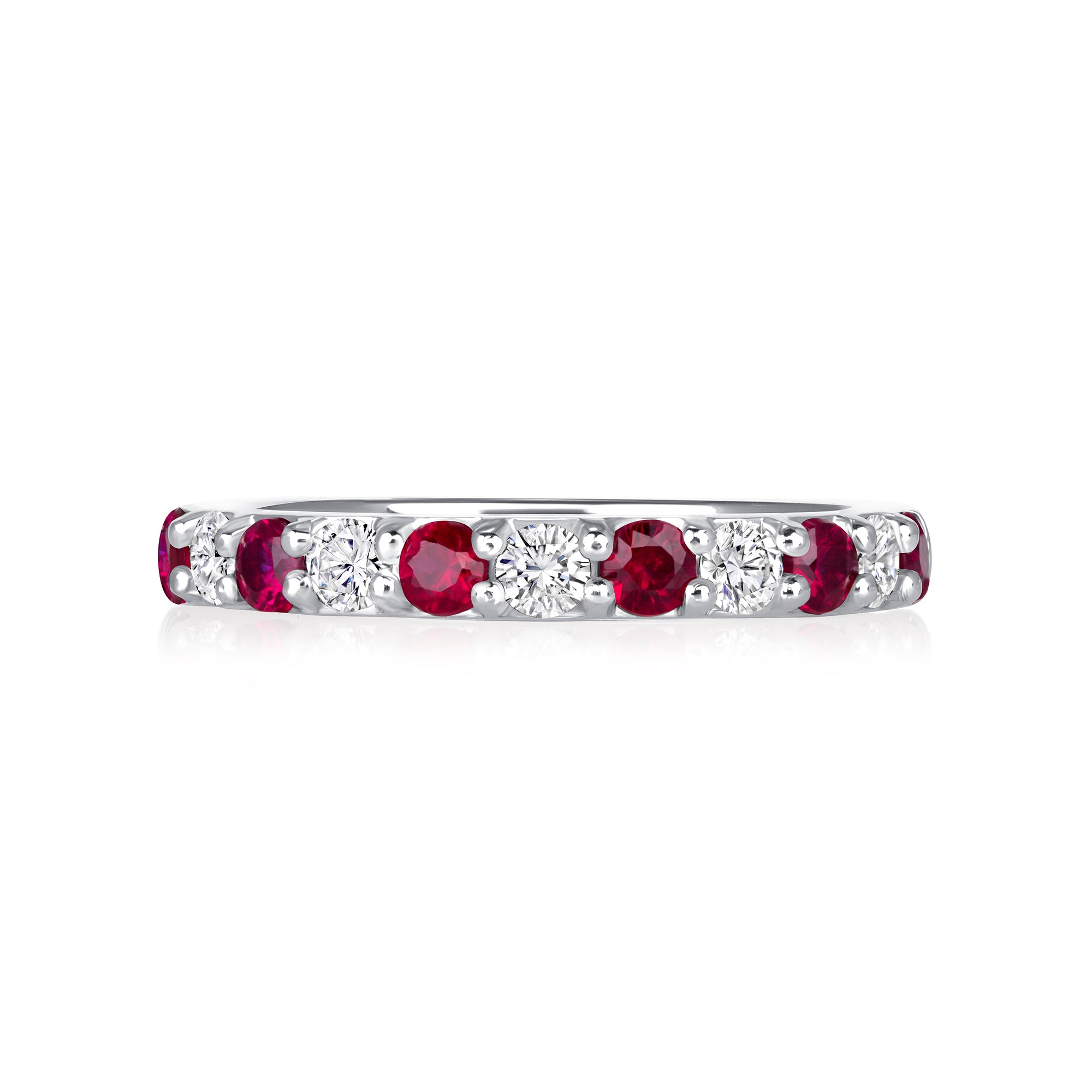 Round rubies and diamonds dance in perfect alternation around this elegant band, creating a rhythmic pattern of rich red and sparkling white. The classic design brings a vibrant pop of color that's both timeless and eye-catching, making it an ideal choice for July birthdays, anniversary celebrations, or simply treating yourself to something beautiful. Stack it with other bands for a layered look or let it shine on its own—either way, this piece adds a touch of romance and sophistication to your everyday style.