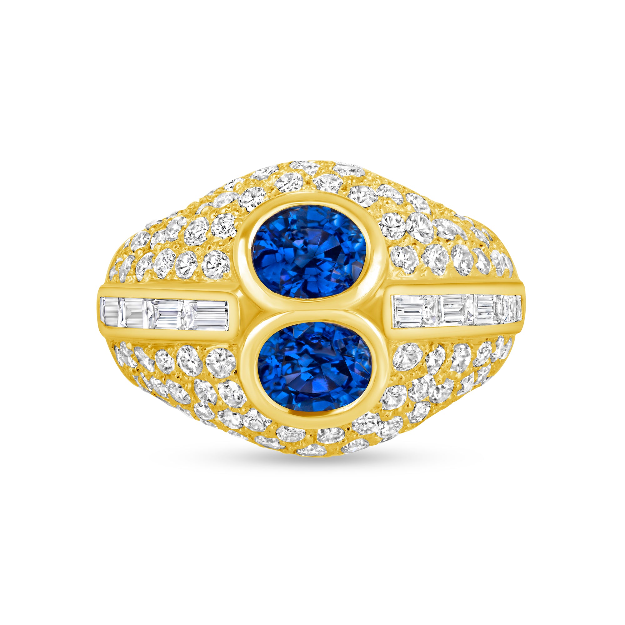 Bold color and brilliant light come together in this striking dome ring, where two vivid blue sapphires sit at the center of a sculptural, pavé-covered design. A mix of round and baguette diamonds enhances the rich 18K yellow gold setting, adding depth, texture, and exceptional sparkle. With its dramatic silhouette and vibrant presence, this piece makes an unforgettable statement—perfect for anyone drawn to jewelry that celebrates artistry and bold luxury.