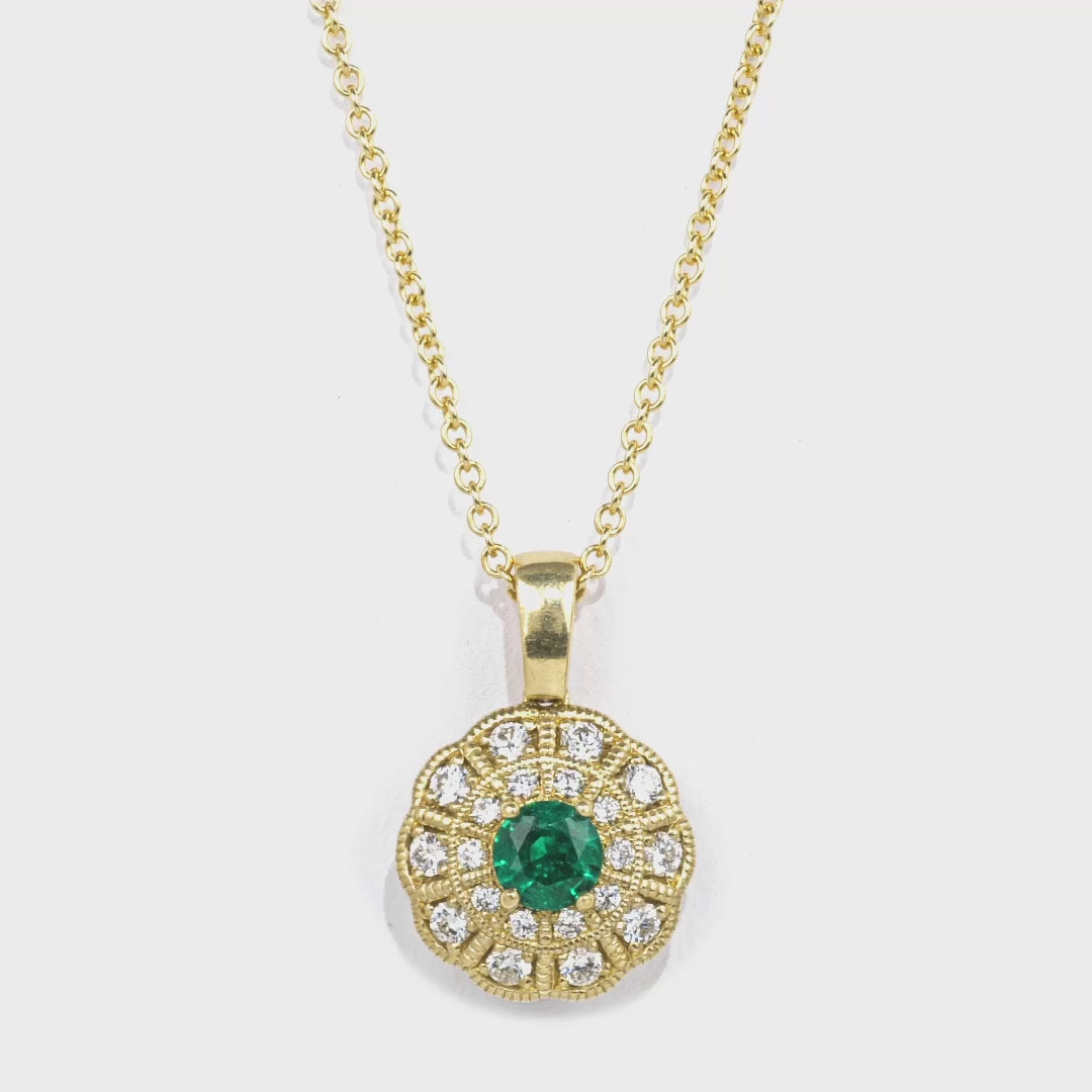 Green Emerald And Diamond Halo Pendant In 18 Karat Yellow Gold