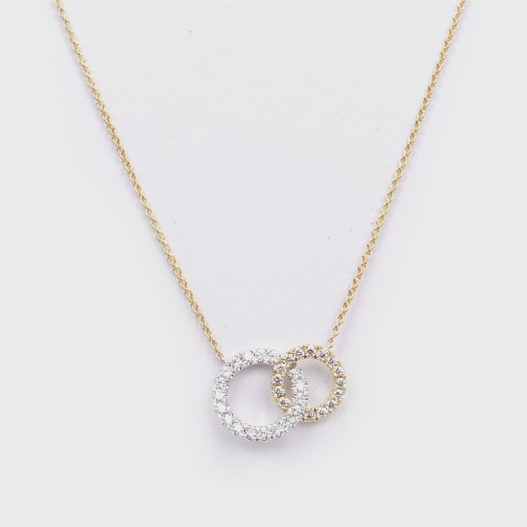 Experience the epitome of luxury with our Linked Diamond Hoop Pendant in 18-karat Two Tone Gold. With a diamond carat weight totaling to 0.42 carats, this pendant necklace features a stunning duo of diamond decorated hoops that are set in yellow gold and white gold diamonds that exudes a celebration of love and sophistication.