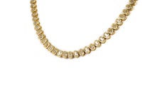 Oval cut bezel set yellow diamond tennis necklace set in 18 karat yellow gold. This necklace includes 90 diamonds that weigh approximately 22.83 carats.