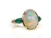 A luminous oval-cut opal sits between two vibrant pear-cut emeralds in this eye-catching ring, all set in warm yellow gold. The opal's iridescent play of color paired with the rich green emeralds creates a bold, nature-inspired look that's perfect for anyone who loves colorful gemstones with personality.