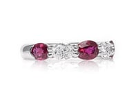 Vibrant oval-cut rubies alternate with sparkling oval-cut diamonds in this elegant band that brings a gorgeous pop of red to your ring stack. The deep, rich crimson of the rubies paired with the brilliant white diamonds creates a striking contrast that's both romantic and regal. Perfect as an anniversary band, birthstone celebration, or simply a treat for yourself, this ring delivers color and sparkle in a design that's effortlessly wearable yet endlessly eye-catching.