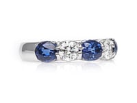 Bold blue meets brilliant white in this striking band featuring alternating oval-cut sapphires and round diamonds. The rich, velvety blue of the sapphires pops beautifully against the crisp sparkle of the diamonds, creating a rhythm of color and light around the finger. Whether you're celebrating a September birthday, marking a milestone, or simply treating yourself to something special, this band offers the perfect blend of classic elegance and vibrant personality.