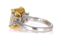 Radiant cut fancy intense yellow diamond and trapezoid diamond side stones ring in 18 karat yellow gold and platinum. The FIY diamond center stone has a VS2 clarity, is GIA certified, and weighs approximately 5.60 carats. The two diamond side stones are trapezoid cut and weigh approximately 0.93 carats. There are a total of 3 diamonds that weigh approximately 6.53 carats.
