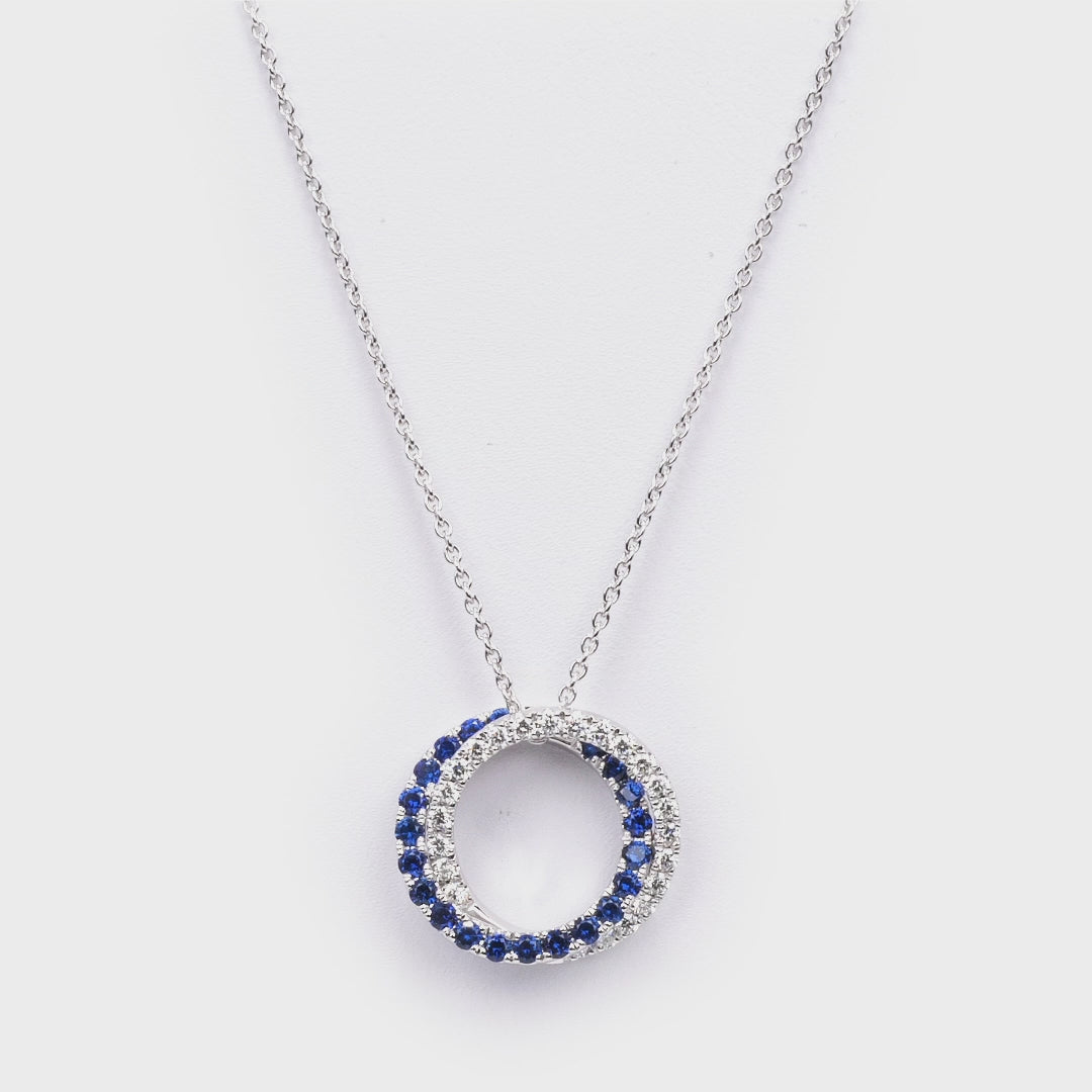 Elevate your elegance with our Stacked Diamond and Sapphire Double Hoop Pendant. Crafted with 18-karat white gold, it features a harmonious arrangement of round brilliant diamonds that weigh a total of 0.28 carats and round brilliant sapphires that weigh 0.63 carats. Together, the diamonds and sapphires radiate grace and sophistication.